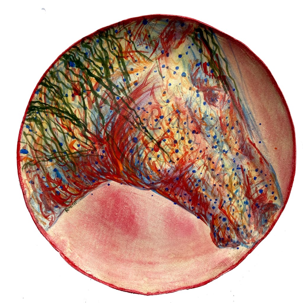 This piece is about 36cm in diameter. Its made of Paper Porcelain Clay – It is not food safe, but a decorative piece. Underglazes, oil paint – varnished.