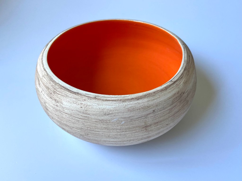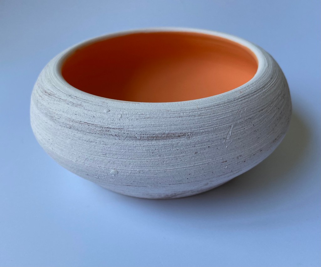 These bowls are a continuation of exploring the idea that true colour is on the inside. The outer surface showing textures and marks are there to contrast the beauty and colour of the inside.