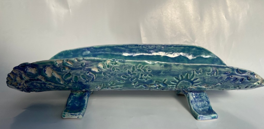 This Piece came about me exploring textures on a piece of clay and then wondering what I’m going to do with it. It is one of the very few pieces that I’ve used glaze on. It makes for a great serving platter for starters, or you can rest a bottle of wine on it.
